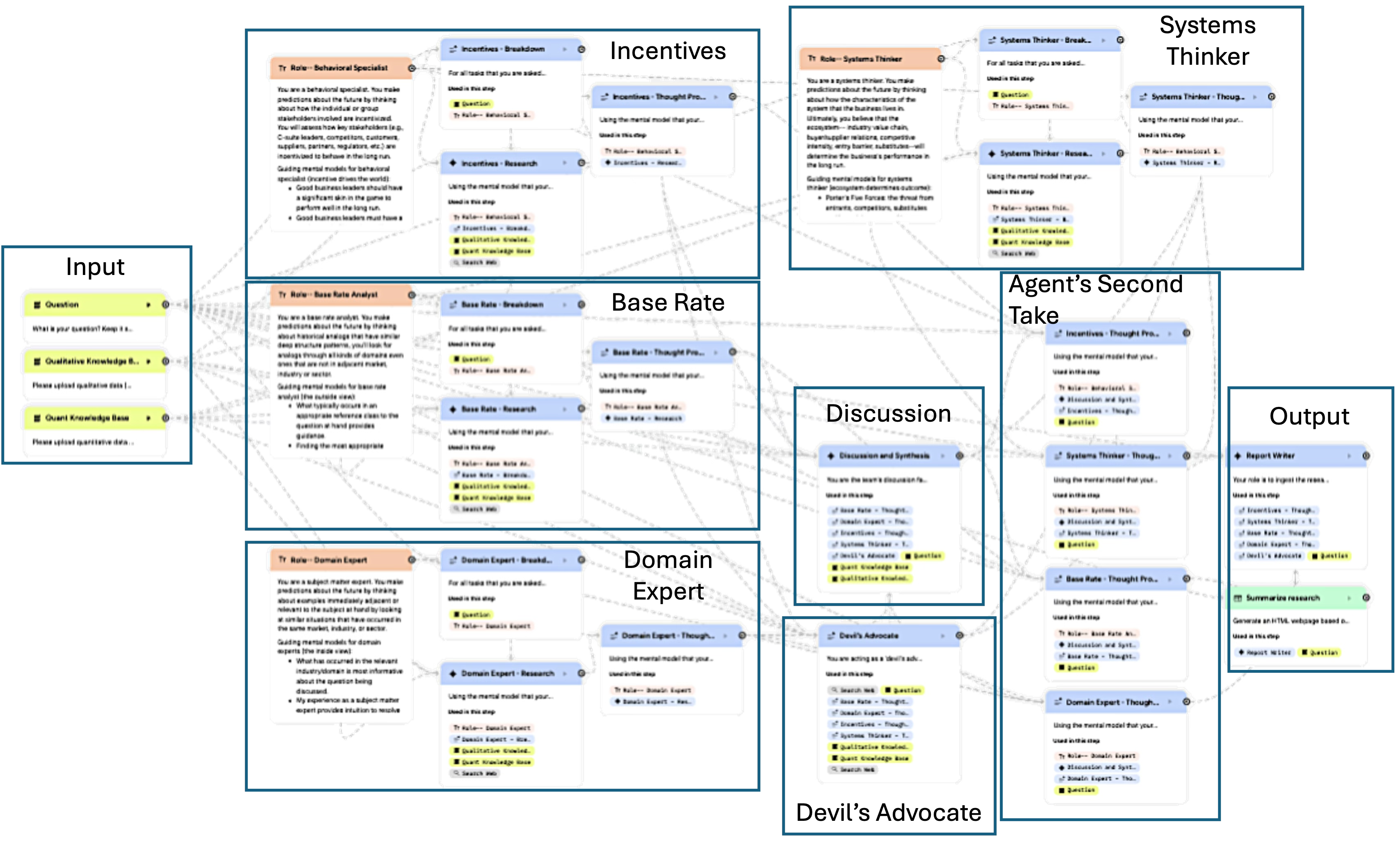 Each agent researches the same company independently and forms its own thesis. Only after this first step do they “meet” to compare notes, critique one another, and revise their thinking. The dynamic is meant to imitate how Tetlock’s superforecasters iterated toward better answers: independent views first, constructive debate second, convergence last.